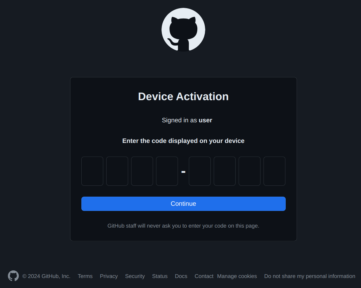 Copy the code from the terminal and paste it into the browser. Then click "Continue." After the code is confirmed, click the "Authorize runtimeverification" button.